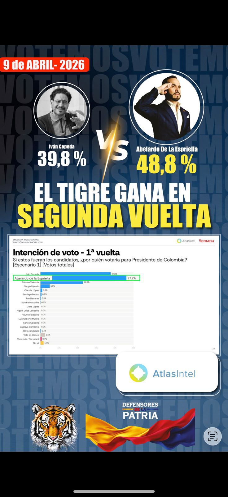 Una reciente encuesta de la firma AtlasIntel, publicada el 9 de abril de 2026, ubica al abogado y candidato presidencial Abelardo De La Espriella como uno de los principales contendientes en la carrera por la Presidencia de Colombia, al registrar un importante nivel de respaldo ciudadano tanto en primera como en escenarios de segunda vuelta.