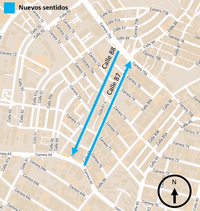 - La calle 88 entre carreras 65 y 75A pasará de doble sentido a único sentido norte-sur (desde la Vía 40 hacia la Villa Carolina).